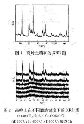 圖1和圖2分別是高嶺土精礦在煅燒前后的X射線衍射圖譜。從圖1的XRD譜圖上,可以看到典型的高嶺土結(jié)構(gòu)的衍射峰,特征值為:d001=7·13,d110=4·35,d111=4·16等。由圖2可見,當(dāng)煅燒溫度為400℃時,這些強峰依然存在,且變化不大,說明煅燒溫度為400℃時,高嶺土沒有被活化。當(dāng)煅燒溫度為500℃時,高嶺土的特征峰強度明顯減弱,說明高嶺土的骨架結(jié)構(gòu)開始遭到破壞。當(dāng)溫度達(dá)到600℃時,衍射峰基本消失,說明高嶺土已轉(zhuǎn)變?yōu)榉蔷B(tài)的偏高嶺石,當(dāng)溫度為700℃、800℃和900℃時,高嶺土保持非晶結(jié)構(gòu)不變。