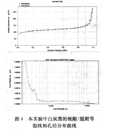 本研究用BET(N2的吸附/脫附)法將本次實驗中制備的白炭黑和外購的氣相法白炭黑進(jìn)行了分析與對比。圖4是本次實驗中所得的沉淀白炭黑的吸附/脫附曲線;圖5的樣品來自于北京華從公司,是用氣相法合成的白炭黑。