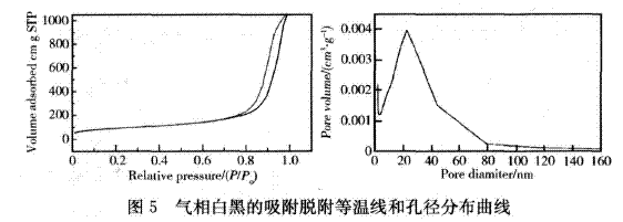 圖4,5呈現(xiàn)出典型的介孔材料的的吸附平衡等溫線,在較低的相對壓力下主要發(fā)生單分子層吸附,至壓力足夠高時,發(fā)生毛細(xì)管凝聚作用,使得吸附等溫線上出現(xiàn)一個突躍。根據(jù)遲滯環(huán)類型,我們判斷圖(4)、(5)樣品呈不規(guī)則狹縫狀型孔道結(jié)構(gòu)。由公式計算出圖5的比表面為360·48m2/g,孔容為0·42cm3/g,平均孔徑為4·8nm;圖5的比表面為315.88m2/g,孔容為1·63cm3/g,平均孔徑為20·7nm。說明我們制備的白炭黑平均孔徑小于氣相法白炭黑的平均孔徑,可能是兩者制備方法差異的體現(xiàn)。