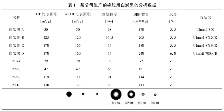 表1是某公司生產的具有代表性的橡膠用 白炭黑分析數據。為了進行對比,還把炭黑的 若干個ASTM數據一并列出。