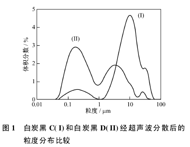 由于二氧化硅表面的高極性及與氫鍵的成 鍵能力,白炭黑聚集體能形成附聚物。在混煉 中由于剪切力作用產生的白炭黑的分散性,可 根據超聲波處理附聚物的易碎程度進行推斷。對水溶液中的白炭黑進行超聲波分散后,可借 助激光繞射測定粒度分布。結果如圖1所示。 由圖可見,與白炭黑C相比,作為高分散性白 炭黑的白炭黑D的小粒徑聚集體數量有大幅度增加。結果表明,白炭黑D有優良的分散 性。