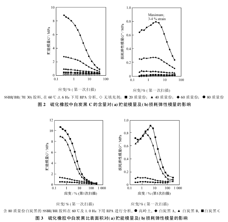 將白炭黑加入到橡膠中,通過二氧化硅網 狀結構的形成,可以使粘度、硬度及模量得到提 高。動態彈性模量與形變的相關性可以以 Payne效應的形式表現出來。在低變形領域,白炭黑網狀結構可以產生高動態彈性模量,但隨 著變形的增加,網狀結構被破壞,動態粘彈性模 量會大幅降低。利用橡膠加工分析儀(RPA)獲得的膠料中 白炭黑C的含量與貯能模量,以及損耗彈性模 量的關系,見圖2所示。由圖可見,隨著白炭黑 含量的增加,Payne效應會增大。另外,白炭黑的比表面積也能對二氧化硅網狀結構的形成產 生很大的影響(見圖3)。在比表面積增加的同 時,聚集體間的距離變短,這時,會形成更多的 網狀結構,Payne效應就會變大。