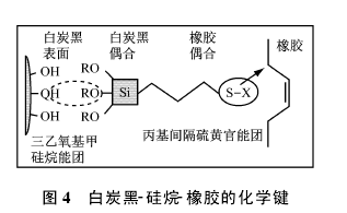 一旦將單官能團的硅烷偶聯劑—烷氧基硅 烷與二氧化硅偶合,就能在白炭黑表面產生疏 水性,從而使白炭黑網狀結構大幅度減少,粘度 降低,進而改善了加工性及硫化特性。但是,由于缺乏較強的白炭黑/橡膠的相互作用,這樣, 被處理過的白炭黑的補強性在大多數情況下依 然不能滿足要求。為了能滿足所要求的補強特性,必須在白 炭黑和橡膠之間生成化學鍵;若能使用雙官能 團的硅烷偶聯劑,就可以形成這種化學鍵。圖 4中示出了含硫黃官能團硅烷偶聯劑的白炭黑-硅烷-橡膠的化學鍵。