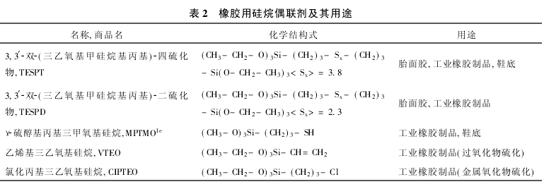 在橡膠行業中,根據用途不同,可使用各種 硅烷偶聯劑。最常見的橡膠用硅烷偶聯劑如表 2所列。含有硫黃官能團的硅烷偶聯劑可用作 硫黃交聯。含有乙烯基的硅烷偶聯劑可用于過氧化物交聯。