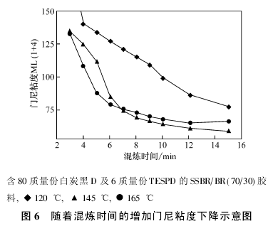 在橡膠母膠中有水分存在的情況下,分子 間縮合會發生生成聚硅氧烷的副反應中,所生 成的聚硅氧烷在橡膠中的活動性差,結果就有 可能使硅烷化的反應效率降低。一旦混煉溫度過高,硅烷化反應就有可能 以比白炭黑分散還要快的速度進行下去,這將 導致硅烷化處理不均勻,其結果會使二氧化硅 網狀結構增加,隨之而來的是補強性降低。混煉中的硅烷化反應的進行狀況,可以根 據混煉時產生的Payne效應,或者用降低門尼 粘度的辦法進行監控。如圖6所示,在120℃ 下,反應速度較為遲緩,經過15min后還是沒 有完成。在145℃下硅烷化處理的速度提高, 在7~8 min之后基本上就完成了。若在165℃ 下反應速度更快了。門尼粘度在達到145℃時 仍未見到下降,這表明,硅烷化處理反應有可能是不均勻的。