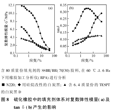 在加入炭黑時,這種固定化主要是通過橡 膠強有力的物理吸附起作用的,而在白炭黑-硅 烷填充劑體系中,白炭黑和橡膠的相互作用比 較弱,所以,就借助于化學鍵使橡膠固定在白炭黑的表面及白炭黑結構中。這種“化學性的”固 定會造成動態彈性模量大幅上升。在硫化時, 依靠白炭黑與橡膠的結合,橡膠內結構和橡膠 自身的網絡這兩種網絡結構形成。白炭黑的網狀結構本身的模量也會產生影 響(圖7)。和其它因素不同,這種網狀結構與 強烈變形存在著相關性。由于應變破壞了網狀 結構,于是便發生了滯后損失。圖8是復數彈性模量和損耗因子tanδ與應變的相互關系示 意圖。從圖8可以看出,假如把白炭黑D和 TESPT配合使用的話,其Payne效應和tanδ就 比單獨使用炭黑與白炭黑D的要小。究其原因,白炭黑與橡膠的互相作用較小,發生化學固 定的橡膠,即便是在高應變范圍內也是非常穩 定的,而且白炭黑網狀結構由于硅烷化反應還 出現了大幅減少的現象。