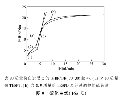 TESPD及TESPT在硫化中基本上是起著硫 黃接受體的作用。只有長鏈的多硫化物在硫化 中才能成為給予體。在使用純二硫化物硅烷的 情況(例如,TMTM之類的硫化促進劑)下,如果不增加硫黃量,交聯反應就不能進行。含TESPT膠料及含TESPD膠料的硫化曲 線如圖9所示。在測定開始時,無論使用哪一 種硅烷,都可以看出,隨著白炭黑發生再凝聚, 扭矩值會有一定的升高[1]。TESPT的初始扭矩值升高要比TESPD的要大些(z)。這是由 TESPT中的多硫化物引起的。在用硫化促進劑 活化之后,母膠的交聯和白炭黑-橡膠偶合就同 時發生了(3)。TESPD的耐焦燒穩定性高,硫化速度快,在混煉時,其耐早期焦燒性成為TESPD 在加工方面一個十分突出的優點。