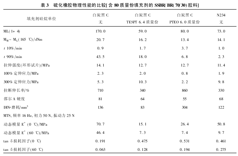 如表3所示,與使用未經過處理的白炭黑 及白炭黑與丙基三乙氧基硅烷PTEO的組合那 樣,不存在硅烷/橡膠鍵的情況相比,白炭黑和 TESPT的組合可使模量以及耐磨耗性得到大幅改善,這種膠料的補強性超過同樣使用炭黑 N234的膠料,并且還能使tanδ降低。