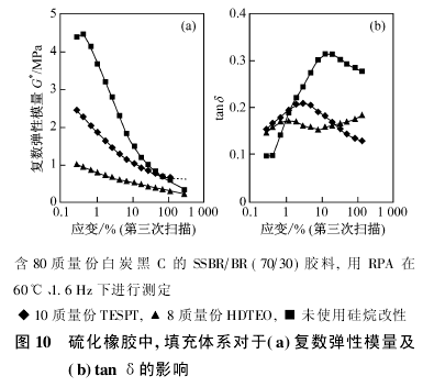 關于白炭黑-硅烷-橡膠的結合,也可使用 RPA加以證明(見圖10)。由于橡膠在白炭黑 表面的固定化,硫化橡膠在高應變領域的復數 彈性模量會變大。這就是使用TESPT(或TESPD)的膠料與使用未處理白炭黑,以及使用 和橡膠不發生偶合的烷基硅烷之十六烷基三乙 氧基硅烷HDTEO膠料之間的最大差異。
