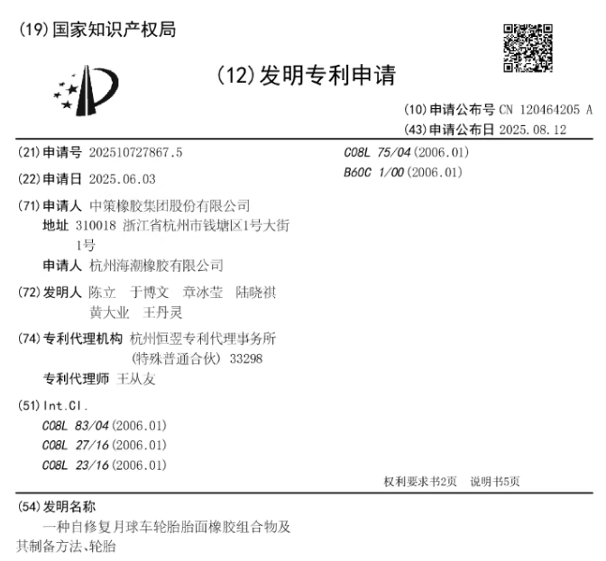 【炭黑產業(yè)網(wǎng)】8 月 22 日消息,國家知識產權局近期公開了一項由中策橡膠集團股份有限公司(簡稱中策橡膠)與合作伙伴聯(lián)合申請的專利,該專利涉及 “自修復月球車輪胎胎面橡膠組合物”,這項創(chuàng)新技術一經(jīng)公開便引發(fā)了行業(yè)內的廣泛關注。