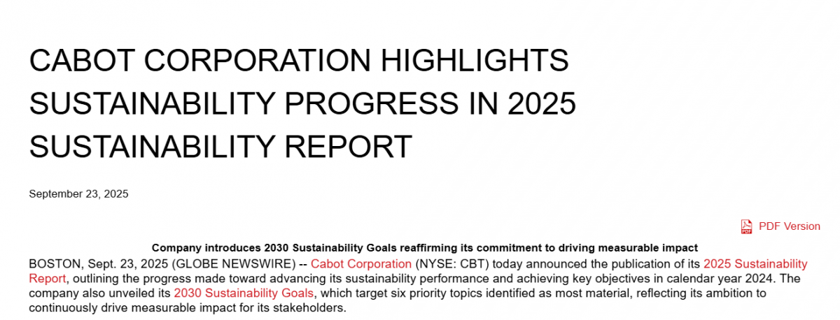 【炭黑產業網】9 月 25 日消息,卡博特公司(紐約證券交易所代碼:CBT)于 2025 年 9 月 23 日在波士頓發布《2025 年可持續發展報告》,披露 2024 年可持續發展績效及關鍵目標進展,同步公布 2030 年可持續發展目標。