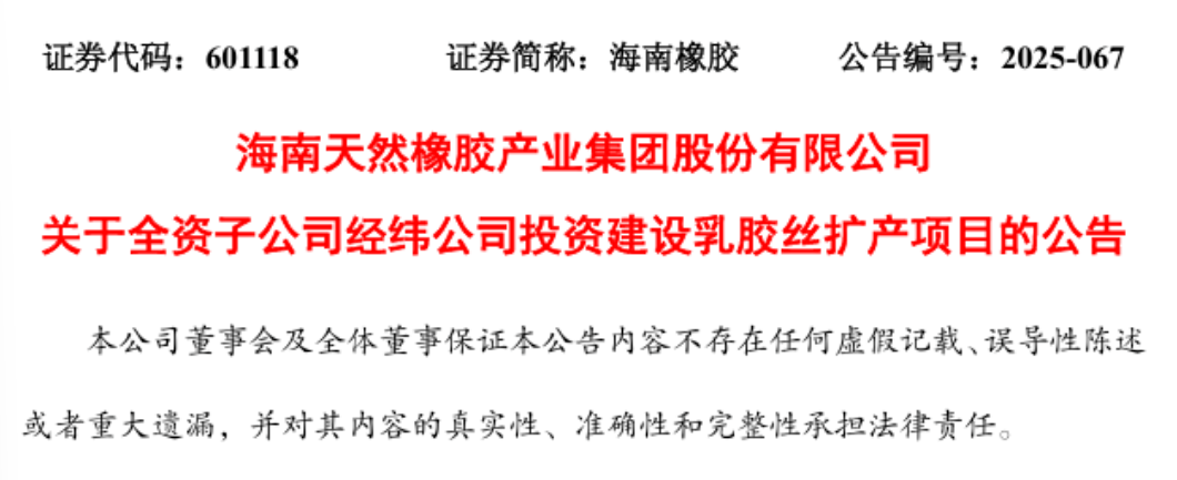 【炭黑產業網】11 月 5 日消息,海南橡膠產業集團股份有限公司(證券代碼:601118,簡稱 “海南橡膠”)于 10 月 31 日發布公告,宣布其全資子公司海南經緯乳膠絲有限責任公司(簡稱 “經緯公司”)計劃投資 1.35 億元,啟動年產 3 萬噸高品質乳膠絲項目(第一期)的建設。該項目投產后,經緯公司乳膠絲年產能將新增 1.5 萬噸,其在行業內的龍頭地位將得到進一步鞏固。