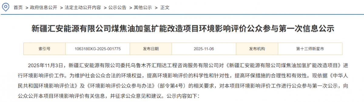11月6日,新疆匯安能源有限公司煤焦油加氫擴能改造項目環(huán)境影響評價公眾參與第一次信息公示。