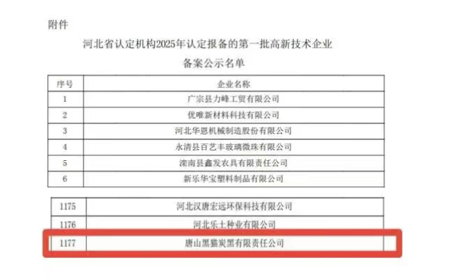 在本次公示名單中,唐山黑貓?zhí)亢谟邢挢?zé)任公司赫然在列,其序號為1177。值得關(guān)注的是,這已是該公司繼2015年、2018年、2022年之后,第四次成功被認定為國家高新技術(shù)企業(yè),充分彰顯了企業(yè)在技術(shù)創(chuàng)新領(lǐng)域的持續(xù)深耕與突出實力。