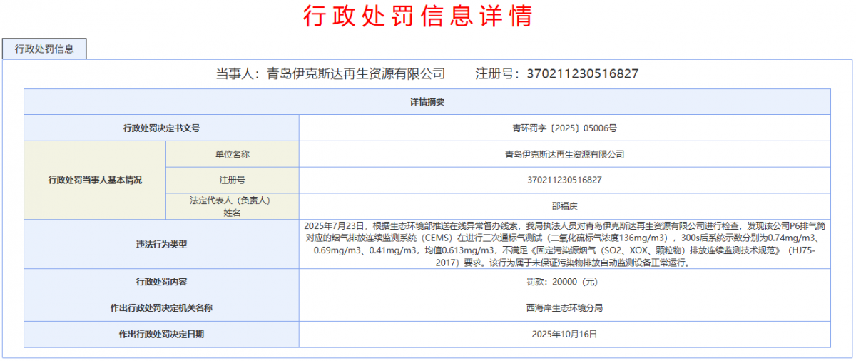 10 月 16 日,青島西海岸新區(qū)生態(tài)環(huán)境分局正式對(duì)青島伊克斯達(dá)再生資源有限公司下發(fā)行政處罰決定書,依據(jù)相關(guān)環(huán)保法規(guī)對(duì)該企業(yè)處以 20000 元罰款,處罰事由為未保證污染物排放自動(dòng)監(jiān)測(cè)設(shè)備正常運(yùn)行。