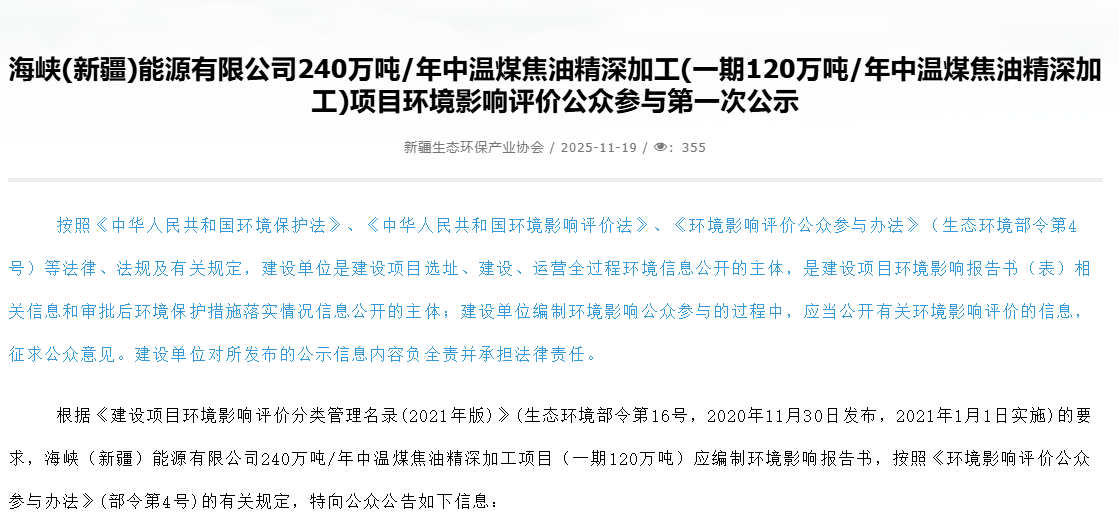 11月19日,海峽(新疆)能源有限公司240萬噸/年中溫煤焦油精深加工(一期120萬噸/年中溫煤焦油精深加工)項(xiàng)目環(huán)境影響評價公眾參與第一次公示。