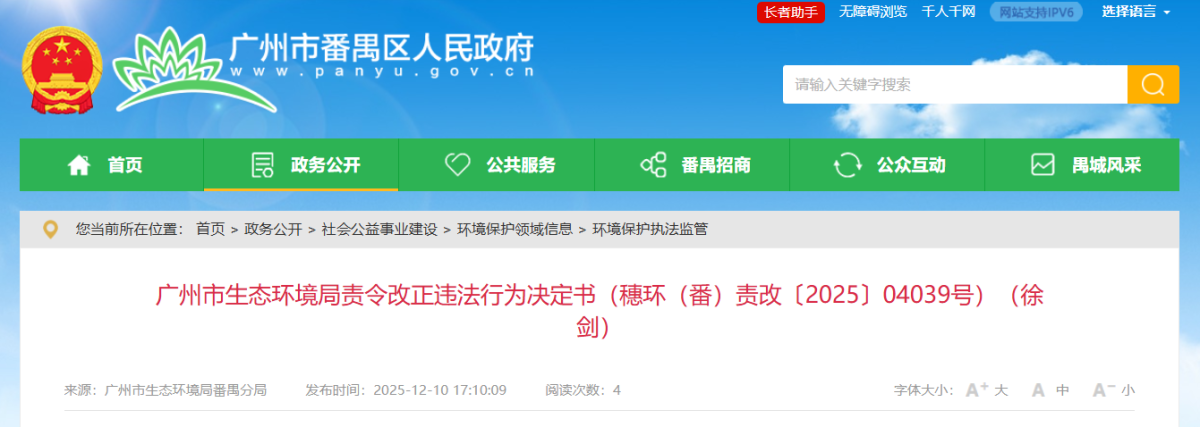 【炭黑產業網】12月23日消息,12月10日,廣州市生態環境局對外公布了一份責令改正違法行為決定書。該決定書顯示,2025年11月20日,廣州市生態環境局番禺分局的執法人員對廣州化龍永光橡膠制品有限公司(簡稱“永光橡膠公司”)展開現場檢查,發現該公司存在一系列問題。