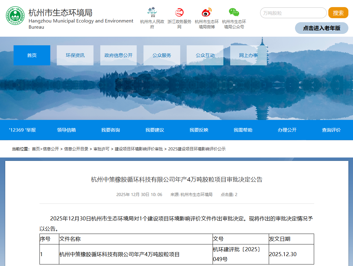 12月30日,杭州中策橡膠循環(huán)科技有限公司年產(chǎn)4萬(wàn)噸膠粒項(xiàng)目審批決定公告,杭州市生態(tài)環(huán)境局同意項(xiàng)目實(shí)施。