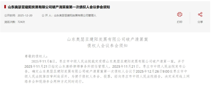 2025年11月21日,棗莊市中級人民法院發布公告,確定山東奧瑟亞建陽炭黑有限公司破產清算案第一次債權人會議于2025年12月26日9:00在棗莊市中級人民法院第四審判庭召開。