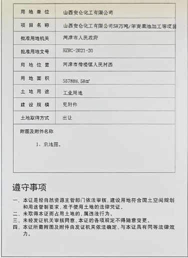 2025年12月26日,山西安侖化工有限公司58萬噸/年炭黑油加工等項目《用地規劃許可證》核發。