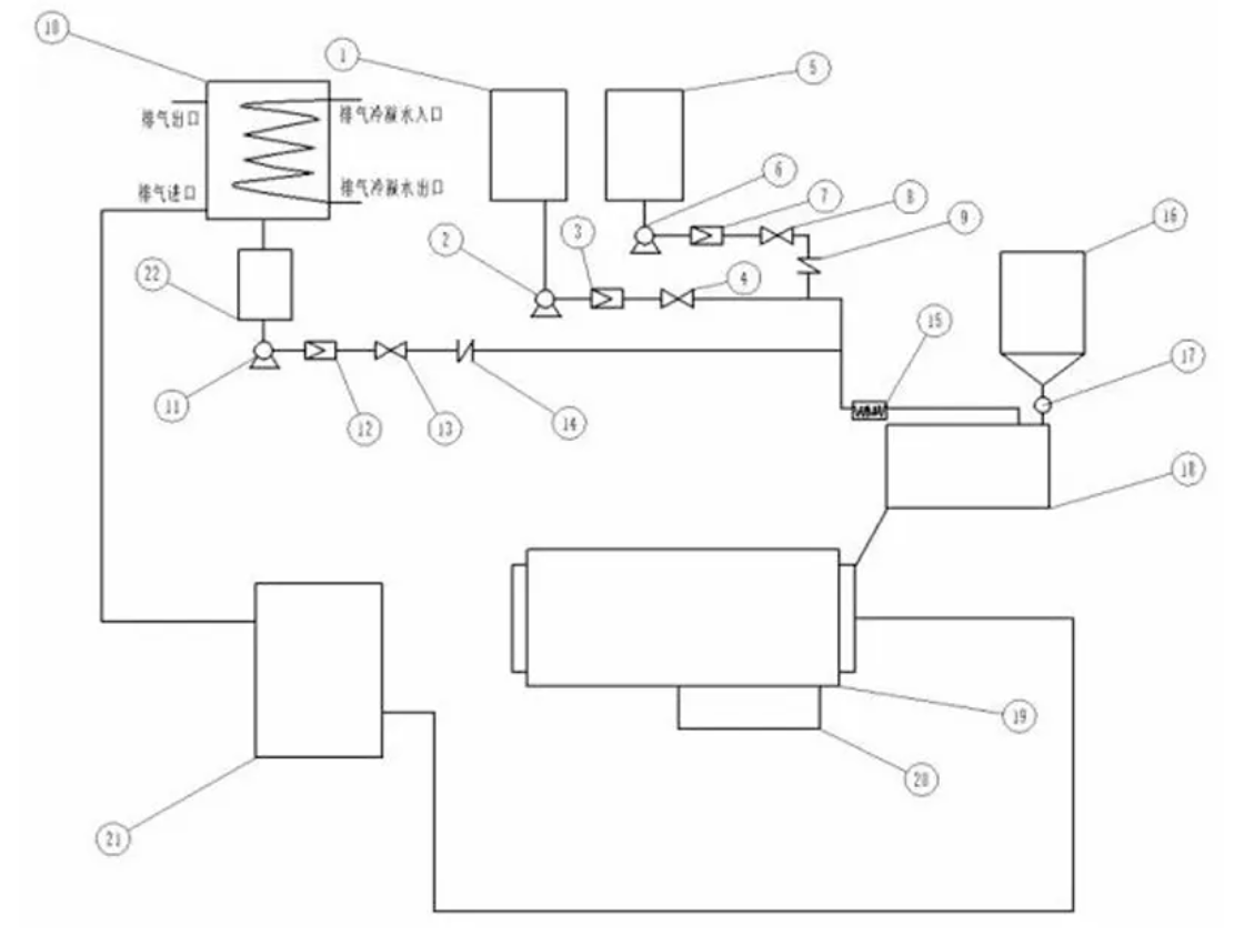 S3.造粒水罐1經(jīng)造粒水泵2,造粒水流量計(jì)3和造粒水流量調(diào)節(jié)閥4引出造粒水,粘結(jié)劑罐5經(jīng)粘結(jié)劑泵6,粘結(jié)劑流量計(jì)7,粘結(jié)劑流量調(diào)節(jié)閥8和粘結(jié)劑止回閥9引出粘結(jié)劑,排氣冷凝水罐22經(jīng)排氣冷凝水泵11,排氣冷凝水流量計(jì)12,排氣冷凝水流量調(diào)節(jié)閥13和排氣冷凝水止回閥14引出冷凝水,在靜態(tài)混合器15中形成混合液;