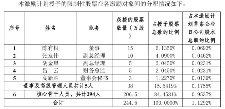 該激勵(lì)計(jì)劃采取的激勵(lì)工具為限制性股票,股票來源為公司從二級(jí)市場(chǎng)回購的公司A股普通股股票。計(jì)劃擬授予激勵(lì)對(duì)象的限制性股票數(shù)量為2,445,000股,占本激勵(lì)計(jì)劃草案公告日公司股本總額216,526,960股的1.1292%。