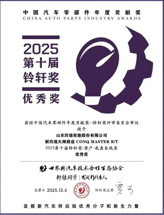 【炭黑產業網】12 月 11 日消息,12 月 6 日,第十屆鈴軒獎頒獎典禮于蘇州圓滿落幕。在這場歷經半年籌備、由 29 位行業專家嚴苛評審的評選中,玲瓏輪胎從超百項參評技術里脫穎而出,一舉將兩項大獎收入囊中,其 “廢舊輪胎制備液體再生膠可循環輪胎應用技術” 拿下前瞻類優秀獎,“新玲瓏大師致途” 輪胎則斬獲量產類優秀獎。這已是玲瓏輪胎第六次斬獲這一汽車零部件領域權威獎項,同時該企業也成為本年度唯一獲獎的輪胎企業,盡顯其在行業內長期領先的創新硬實力。