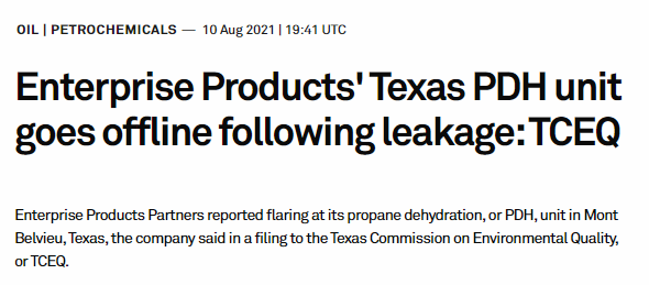 近期,Enterprise Products Partners報告稱,其位于得克薩斯州的丙烷脫氫裝置(PDH)發生泄露。