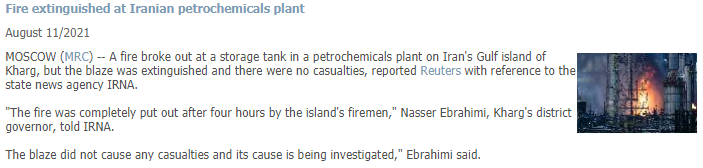 據伊朗石油部的沙納通訊社報道,8月10日,伊朗海灣哈格石化公司的甲醇儲罐發生火災,目前火勢已得到控制,沒有人員傷亡。