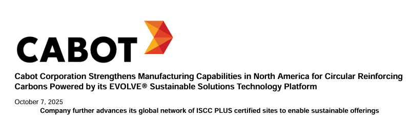 作為推進循環經濟與可追溯性承諾的一部分,卡博特還擴大了其全球網絡中 ISCC PLUS 認證生產基地的數量,進一步提升為客戶提供第三方認證可持續解決方案的能力 —— 這類方案兼具工業化規模與可靠性能。目前,卡博特在歐洲、美洲及亞洲地區已有 12 家認證生產基地為其補強炭黑產品組合提供支持,同時在歐洲擁有 2 家認證色母粒與復合料)生產基地。