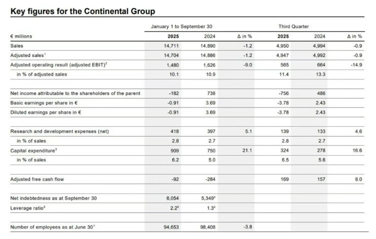 據炭黑產業網了解,在2025年第三季度,大陸集團實現合并銷售額49.5億歐元(約405.9億人民幣),同比微降0.9%。若不考慮匯率影響和整合范圍變化,有機銷售額增長2.6%。集團調整后的營業利潤為5.65億歐元(約46.33億人民幣),下降14.9%。上一季度因Vitesco Technologies向大陸集團支付1.25億歐元,調整后的息稅前利潤大幅增加。調整后的息稅前利潤率為11.4%,低于2024年第三季度的13.3%。因計劃出售OESL業務領域,適用會計準則IFRS 5,待售業務自2025年8月26日監事會批準以來未確認折舊。若不采用該準則,調整后的經營業績為5.58億歐元(約39.74億人民幣),調整后息稅前利潤率為11.3%。第三季度的凈利潤為 -7.56億歐元,2024年第三季度為4.86億歐元。歐摩威分拆和計劃出售OESL產生的非現金特殊影響,使息稅前利潤減少11億歐元,這些影響源于貨幣折算差異以及OESL凈資產與預期售價的差異,也對凈收入產生負面影響。不過,調整后的自由現金流同比增長8.0%,達到1.69億歐元(2024年第三季度為1.57億歐元)。