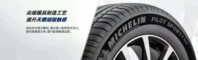 米其林在輪胎“黑”的探索上同樣成果斐然。其曜黑工藝運用鉆石光源反射原理,造就出高端優雅的深黑效果。該原理讓胎側吸收更多光線、減少反射,使黑度更接近純黑,盡顯獨特高端。胎側的黑白方格旗圖案會隨光線移動產生漸變視覺效果,靈動非凡。尖端模具制造工藝賦予胎側天鵝絨般的觸感,納米技術激光雕刻通過縮小胎側條紋設計,打造高黑度光阱,進一步提升胎側觸感品質。