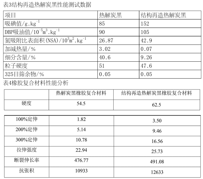據了解,關于熱解炭黑活化改性的方法眾多,目前已經有大量的專利報道,但是所涉及的方法基本都是在已獲得的熱解炭黑的基礎上進行除雜、活化等處理方式,處理后的熱解炭黑在制備橡膠復合材料時,雖然強度有了一定的改善,但是其300%定伸強度依然很低,無法滿足輪胎的使用要求。300%定伸強度主要與熱解炭黑本身的結構度息息相關,熱解炭黑的結構度越高,其300%定伸強度的值就會越大。根據材料性能與材料結構的相關關系,可以清楚的認識到,目前對于熱解炭黑進行處理的相關方法和工藝手段,未能從根本上解決熱解炭黑結構度低的問題。而本發明可解決現有技術中存在的上述問題。